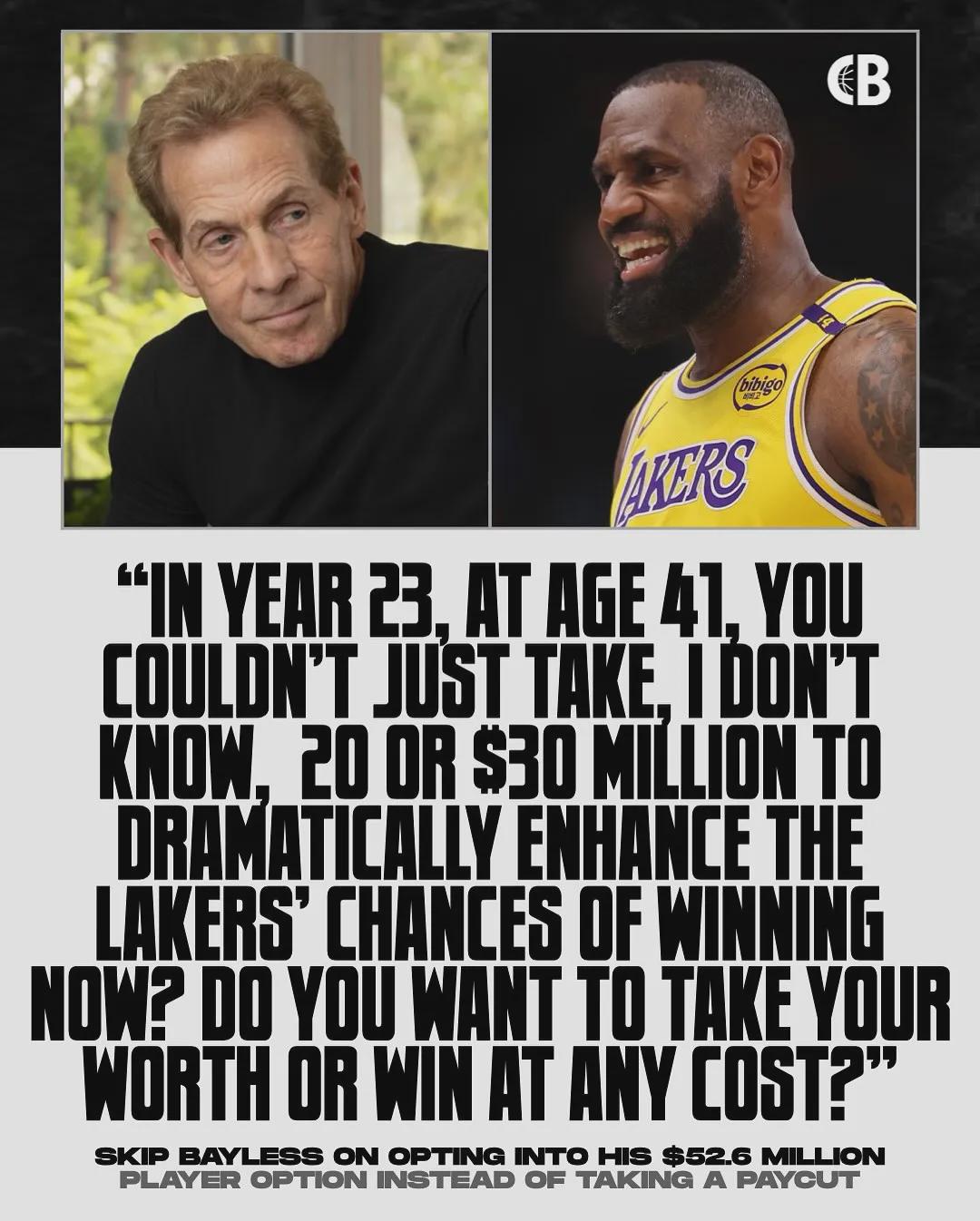 Bayless说道“23年,41岁。你不能只拿2000万或3000万来大幅提高湖人队现在的胜算…勒布朗,你是想拿回你的价值,还是想不惜任何代价赢得比赛?”
