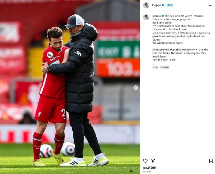 #克洛普悼念若塔# 前利物浦主帅克洛普在社媒发文,悼念昔日爱徒若塔。克洛普写道:“这是一个令我痛苦的时刻,这其中必有更深远的意义,但我却无法参透!”“听闻迪奥戈和他的兄弟安德烈离世的消息,我心如刀绞。迪奥戈不仅是一位出色的球员,更是挚友、充满爱意的丈夫与父亲!我们将深深怀念你!”“向露特、孩子们、亲友以及所有爱他们的人致以全部的祈祷、思念与力量!安息吧,若塔。” #利物浦前锋若塔去世#