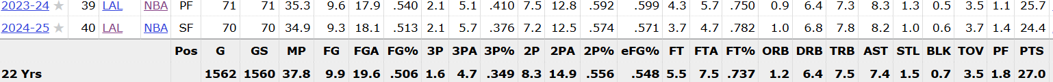 据统计,勒布朗在1562场比赛中总计得到42184分,场均约为27.006分,这只是勉强达到27分的及格线。而在过去的两个赛季中,勒布朗每个赛季出战70场左右,场均得分大约在25分左右。随着卢卡·东契奇承担更多主要得分任务,勒布朗的场均得分可能还会进一步下降。